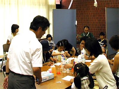 のりと蛍光色素を使って、好みの蛍光スライムを作るコーナーは、子供たちに人気のコーナーです。