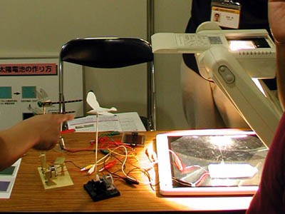 植物の光合成をヒントに開発されている色素太陽電池のデモが開催されました。色素太陽電池の特長はコストが低いこと。耐久性と発電能力の向上が普及のカギとか。