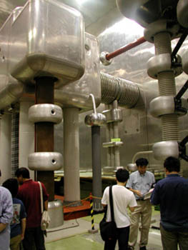 日本で初めて建設された大型加速器で、1977年に実験を開始しました。物質科学の研究のほか、ガンの治療にも利用されてきました。前段加速器では75万ボルトの直流電場で光速の4%まで加速します。線形加速器では126個の電極を利用して光速の28%まで加速します。