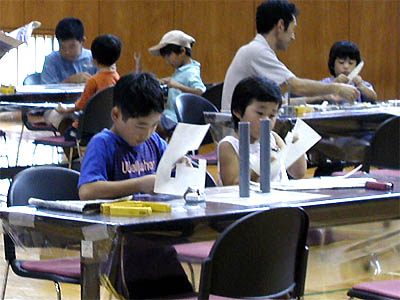 分光器作り、ラジオの製作、声を遠くまで飛ばす実験など、様々な子供向けの催し物が開催されました。体育館では、紙飛行機を製作して滞空時間を競うコンテストが開催されました。紙飛行機作りに真剣に取り組む子供たちの目の輝きが、印象的でした。