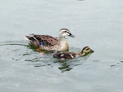 10日ぶりに、親子に合うことが出来ました。母親と比べると、成長した様子が良く分かります。梅雨の合間のくもり空。オスのカモは地上で休憩していましたが、ヒナ達は元気に泳いでいました。カメラを向けると、ヒナ達は寄ってきてくれました。すると、地上にいた母鳥がヒナたちの傍へやってきました。人間に警戒することを教えていたのかもしれません。