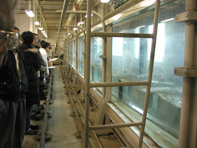 風浪実験水槽の見学では、水面に吹き付ける強い風で波しぶきがたつ様子を観察しました。感動です。
